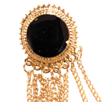 Introducing the **Majestic Anoir Brooch vintage lapel Pin Brooch with rhinestone Harness** by Dupsie's African Fashion, a stunning accessory that exemplifies sophistication and style. This exquisite circular lapel pin features a rich black stone, elegantly bordered by a gleaming gold-colored frame. The intricate detailing of the gold finish enhances its luxurious appeal, while the delicately cascading gold chains adorned with sparkling rhinestones bring an added flair of brilliance.