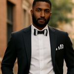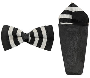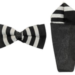 Introducing the "Dasibre" Handwoven Kente Bow Tie and Pocket Square Set by Dupsie's African Fashion. This striking black and off-white (silver/grey) Kente bow tie and pocket square set offers a sophisticated touch of African heritage to any ensemble. Meticulously handwoven, this Kente cloth accessory embodies the rich cultural significance of Ghanaian artistry. The bold black and off-white stripes of this Kente cloth design create a visually captivating pattern. In Kente tradition, black symbolizes maturity, intensity, and spiritual energy, representing the heightened awareness and connection to ancestry. The off-white/silver/grey signifies joy, festivity, and new beginnings, symbolizing the optimism and promise of a fresh start. This elegant combination of black and off-white Kente cloth makes the Dasibre a truly unique piece, ideal for those seeking a touch of African elegance.