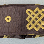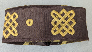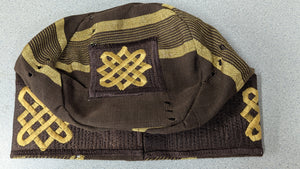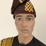 Crafted from premium Aso Oke fabric, this brown and gold kufi cap is a testament to traditional Yoruba craftsmanship. A three-inch band of rich brown embroidery encircles the base, providing a striking foundation for the elaborate gold embroidery that adorns the crown. The gold embroidery features an interlock symbol, representing unity and connection, interwoven with a diamond shape, symbolizing strength and resilience. This powerful combination embodies the enduring spirit of Yoruba culture. Adjacent to the interlock symbol, a circular gold embroidered design represents continuity and the cyclical nature of life. These symbols, steeped in Yoruba tradition, elevate this fila from a simple hat to a statement piece.