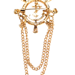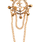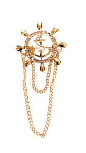 Introducing the "Golden Ankof Helm bordered Anchor" vintage Lapel brooch Pin by Dupsie's African Fashion. This unique lapel pin is a stunning blend of vintage nautical charm and African-inspired design. The gold-colored circular helm lapel pin is intricately bordered with a ship's wheel motif, creating a striking visual focal point. At the center of the helm lapel pin, a detailed anchor design adds a touch of classic maritime elegance. The anchor on this lapel pin is further enhanced by a delicate rope detail wrapped around its crossbar, adding depth and texture to this exquisite piece. Sparkling rhinestones encircle the helm of this lapel pin, adding a touch of glamour and catching the light beautifully. Two delicate gold chains dangle gracefully from the bottom of this helm lapel pin, swaying gently with every movement.