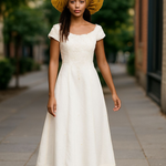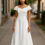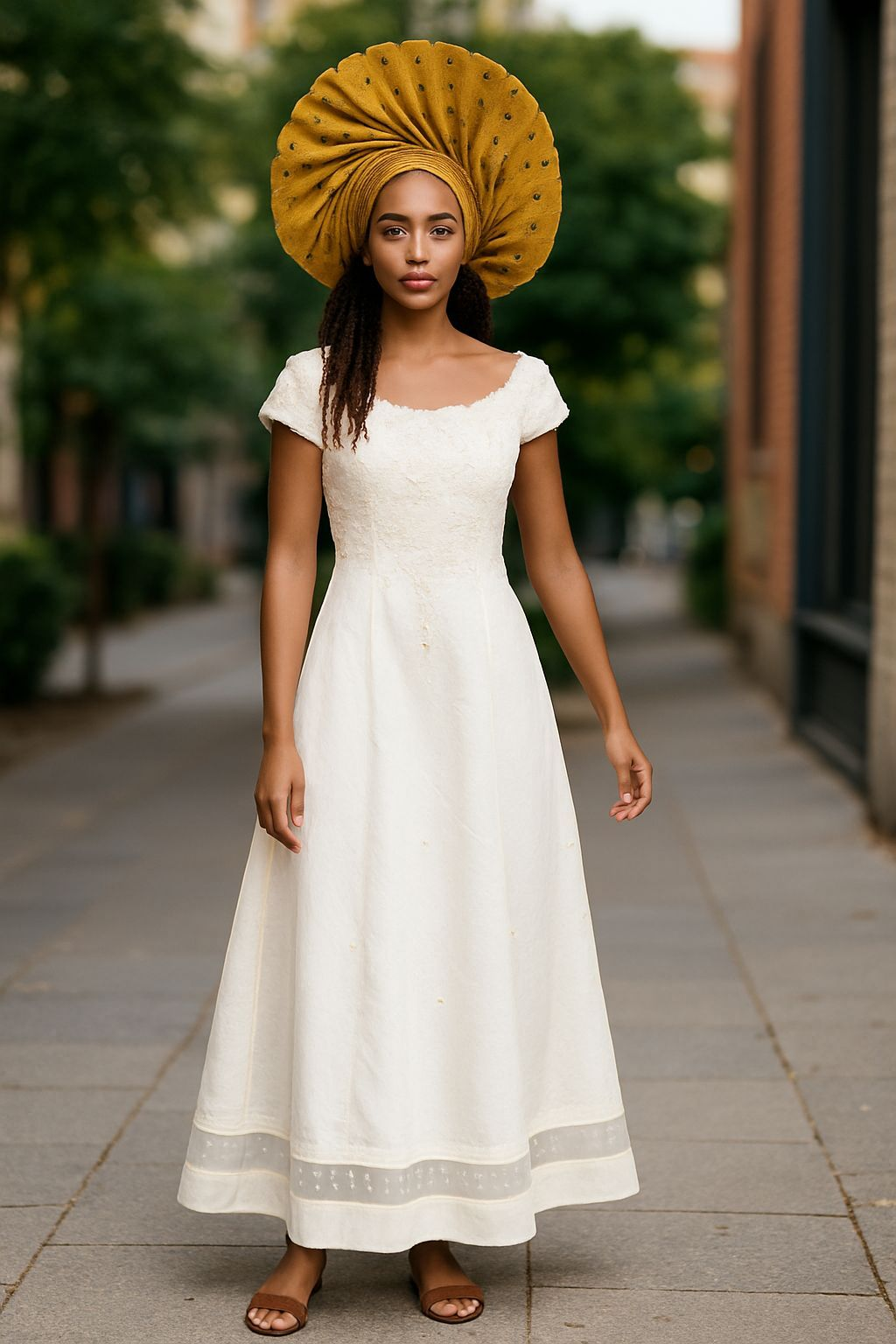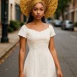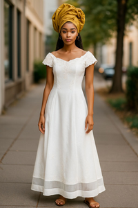 Introducing "Nika," a breathtaking ivory satin dress, a testament to Dupsie's African Fashion's exquisite craftsmanship. This satin maxi dress flows elegantly from the hips, embodying modern African satin fashion. The boat-neck satin dress design is accentuated with intricate embroidery, a hallmark of high-quality satin dresses. Delicate pearls adorn the neckline of this satin gown, creating a captivating visual appeal. The back of this ivory satin dress features a concealed zipper, elegantly hidden beneath a vertical row of shimmering pearls, a sophisticated detail often found in the finest satin dress creations. This ivory satin dress radiates purity and grace. The ivory satin fabric symbolizes new beginnings and timeless elegance, making it perfect for weddings and celebratory satin dress occasions.