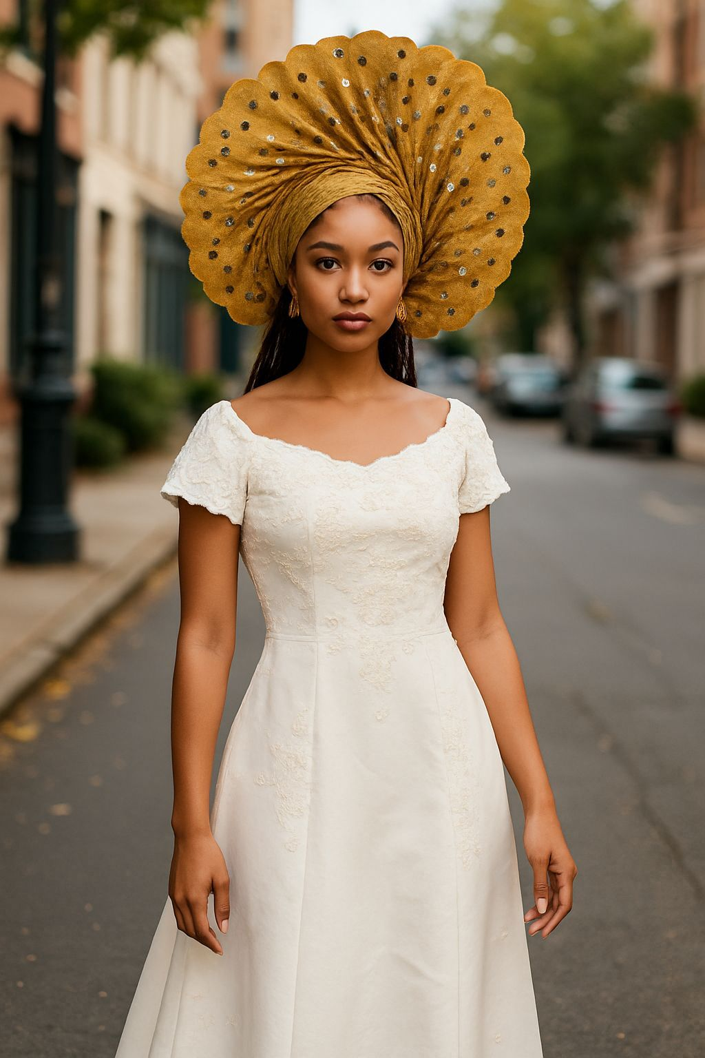 This ivory satin dress, with its exquisite pearl and embroidery details, will undoubtedly make you the center of attention. The Anika satin dress is more than just a garment; it's a work of art. This satin creation, a masterpiece of African satin fashion, is a must-have for any discerning woman. Please note that the autogele African hat is not included with this exquisite satin dress.